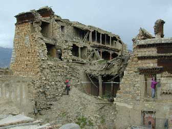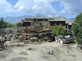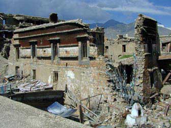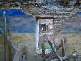 Von dem Haupgebäude mit der Versammlungshalle stehen nur noch die Wände. Die Geschossdecken sind, abgesehen von dem nördlichen Gebäudeteil, komplett eingestürzt. Die Stabilität der Aussenwände ist insbesondere im südwestlichen Gebäudeteil nicht mehr gewährleistet, da hier die Ecke eingestürzt ist und somit kein aussteifender Verbund zwischen den einzelnen Wandscheiben mehr gegeben ist. Durch die fehlenden Dächer werden die Lehmmörtelschichten in den Wänden ausgewaschen. Die Durchfeuchtung führt in den kalten Jahreszeiten zu Frostschäden und zur Sprengung des Mauerwerks. Die noch stehende Gebäudesubstanz ist extrem einsturzgefährdet und muss umgehend (möglichst vor dem Winter 2000/2001) gesichert werden. In erster Linie ist dies erforderlich, um Schäden durch einstürzende Teile von den umliegenden Behausungen und ihren Bewohnern abzuwenden, zum Anderen ist dies die letzte Chance, einen gestalterischen Eindruck des ursprünglichen Gebäudes zu wahren. Thorsten Schütze, Lhasa, 7.8.2000 |