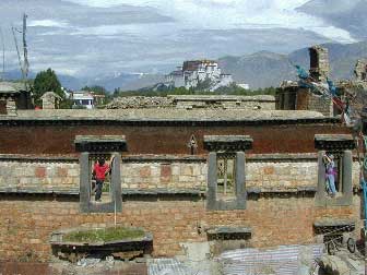 kunst | Zur Geschichte des Klosters "Shide Dratsang" Beschreibung der Baugeschichte und Nutzung des Gebäudekomplexes in Lhasa auf Grundlage eines Interviews mit einem 82 jährigen Bewohner: Am 2.8.2000, morgens um 8 Uhr komme ich zusammen mit der Übersetzerin Namgyal Dolma nach tagelangen Versuchen endlich in die Wohnung des alten Mönchs, der noch schlafend im Bett liegt. Seine Cousine weckt ihn und er beantwortet uns, noch nackt im Bett liegend, die ersten Fragen. Um uns die verschiedenen Nutzungsbereiche des Klosters zeigen und beschreiben zu können, erklärt er sich bereit, sich anzukleiden und mit uns das Gelände zu begehen. Herr Dutu Kushio La ist im Jahre 1918 geboren worden und mit der Geschichte des Klosters sehr gut vertraut, denn er hat dort schon als kleiner Junge mit den Mönchen gespielt. Von 1949 bis 1960 lebte er, mittlerweile selbst Mönch, zusammen mit 300 bis 400 anderen in dem Kloster. Nach seinen Angaben hat er auch in der Zeit danach ununterbrochen in der Anlage gewohnt. Das Klostergebäude soll im Jahre 1960 zerstört worden sein. Es ist wahrscheinlich, dass sich die Beschädigungen zu dieser Zeit nur auf den Innenraum des Hauptgebäudes sowie auf ein nordwestlich gelegenes und heute nicht mehr existentes Wohngebäude bezogen haben, da die Gesamtanlage von ~1965 bis 1984 von den chinesischen Truppen besetzt und zum großen Teil als Kaserne genutzt worden ist. Hinweise hierfür finden sich an der Innenseite der nördlichen Klosterwand, die mit großformatigen chinesischen Schriftzügen bemalt ist. Die Bedeutung dieser Schriften lautet "Chinesen und Tibeter sind gleich" sowie "Chinesen und Tibeter haben die gleiche Mutter und sind wie Brüder und Schwestern". 1984 verließen die Truppen die Klosteranlage und schufen somit Raum für die heute dort lebenden Menschen. Das Gelukpa-Kloster wurde zur Zeit des 7. Dalai Lamas (Kälsang Gyatsho, 1708-1757) gegründet. Die zweigeschossige Hofbebauung wurde ausschließlich für Wohnzwecke genutzt. Die Erdgeschoss- sowie die Obergeschossebene waren ursprünglich hofseitig als Laubengangerschließung und somit sonnen- und vor Regen geschützt ausgebildet. Die religiösen Tätigkeiten, wie beten und studieren wurden ausschließlich im eigentlichen Klostergebäude durchgeführt. Der heutige, an der Südseite der Klosteranlage gelegene Haupteingang diente ursprünglich auch zu diesem Zweck. Allerdings stand die Gesamtanlage wesentlich freier und weniger von umgebender Bebauung eingeschlossen wie heute. So befanden sich zwei Gebäude dem Haupteingang südlich vorgelagert, eins westlich und eins östlich, die große Gebetsmühlen behausten. An der Stelle des westlichen befindet sich heute eine halböffentliche Toilette. An der Westseite verspringt der Wohnriegel zur hofabgewandten Seite. In diesem Versprung ist eine Gebäudefuge ablesbar, welche die Trennung zwischen dessen südlichen Teil, die ehemalige Klosterküche und dem nördlichen Teil, eine später angebaute Toilette, definiert. Der ehemalige, heute zugemauerte Außeneingang zur Küche, befand sich an der Südseite des Vorsprungs und diente zur Anlieferung der Nahrungsmittel sowie der Brennstoffe (Feuerholz und Kuh-, bzw. Yakdung), die in einem eigens dafür errichteten, freistehenden und zweistöckigen Gebäude gelagert wurden, welches sich östlich der Küche auf einem offenen Platz befunden haben soll. Das Dach des Küchenraumes wird von vier Säulen getragen und ragt über den umgebenden Dachbereich hinaus, um eine ausreichende Belichtung und Belüftung des Raumes zu gewährleisten. Die Nahrungsmittellager befanden sich um die Küchenräume herum. Nordwestlich des hofseitigen Küchenzuganges befindet sich der Brunnen, welcher die gesamte Klosteranlage mit Trinkwasser versorgt hat. Heute dient hierzu eine zentrale Wasserstelle in der Mitte des offenen Klosterhofes. Nördlich des Küchen- und Toilettenbereiches verspringt das Gebäude in der Vertikalen und wird dreigeschossig. Auch dieser Teil ist ausschließlich für Wohnzwecke genutzt worden. Der nordöstlich gelegene Labrang stellte eine Einheit innerhalb der Klosteranlage dar. Er besaß Eingänge an der Süd-, Ost- und Westseite. Das Gebäude diente als Wohnraum für die persönlichen Bediensteten des obersten, leitenden Lama (von 1934 bis 1959 war dies Reting Rinpotsche), beinhaltete Lager für Nahrungsmittel und mindestens zwei Küchen für die Bediensteten und den Lama. Die Wohnbereiche sind geschossweise den Dienstgraden zugeordnet. So hat der Schatzmeister, der direkt dem Rinpotche untergeordnet war, im obersten, dem 3. Geschoss gewohnt. Die Residenz des Rinpotche (Reting Lama) befand sich im ursprünglich 5-stöckigen Nordflügel, der nördlichen Begrenzung des Hauptklostergebäudes, hinter den Lakhang, in den Obergeschossen (3., 4. bzw. 5. Geschoss). Die Decke seines Wohnraumes wurde von 16 Säulen getragen. Daraus leitet sich auch der Name dieses Raumes "Zum Chin" (16 Säulen) ab. Am westlichen Ende, ebenfalls in den Obergeschossen des Riegels, befanden sich die Toiletten, während die Untergeschosse zur Lagerung verschiedener, nicht vergänglicher Güter dienten. Südlich dieses Bereiches, über dem Lakhang, befanden sich Räume zur Versammlung und zur Bewirtung von Gästen. Hier wird auf die Paläste im Norbu-Lingka verwiesen, die in den oberen Geschossen eine ähnliche Raumstruktur aufweisen. Das Hauptheiligtums "Ji-Ji-Lakhang", dessen Decke ebenso wie die der angrenzenden Lakhang durch jeweils 4 Säulen getragen wurde, beherbergt drei Buddhas, die nicht näher definiert werden können Im westlichen Lakhang befand sich der nach Süden ausgerichtete "Jawa-Champa-Buddha", der Buddha der Zukunft, während sich im östlichen (Gandhe-) Lakhang der auch nach Süden ausgerichtete "Ji-Abissem-Buddha" befand. Beide Lakhang dienten außer zur Beherbergung der Buddhas als Bibliothek im weitesten Sinne, d.h. zur angemessenen Lagerung heiliger Bücher. Die Regale befanden sich an der Ost- bzw. an der Westwand. Der Dokh